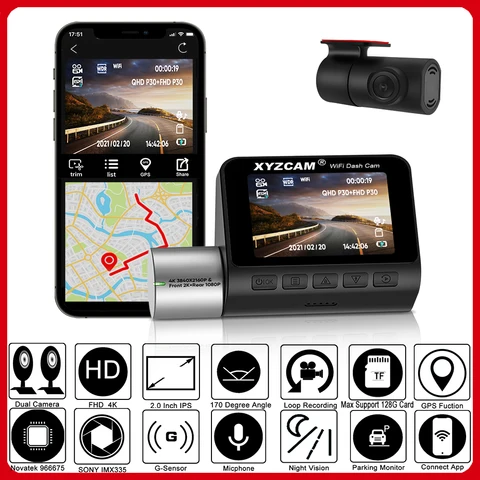 XYZCAM 2K 4K Dual Dash Camera 2.0 Inch LCD WiFi Car DVR 24H Parking Support GPS Track 1080P Rear Cam 170° FOV Auto Recorder