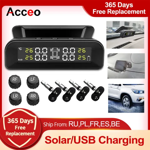 Acceo Smart TPMS Car Tire Pressure Alarm Monitor System 4 Sensors Display Solar Intelligent Tyre Pressure Temperature Warning