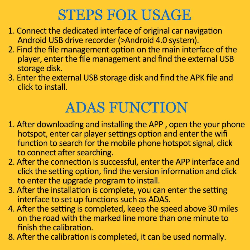 -Support car and mobile interconnection, mobile APP connection; ADAS intelligent assistant system.(Need to be connected to Android 4.0 above car audio,you can order with our car DVD palyer together)