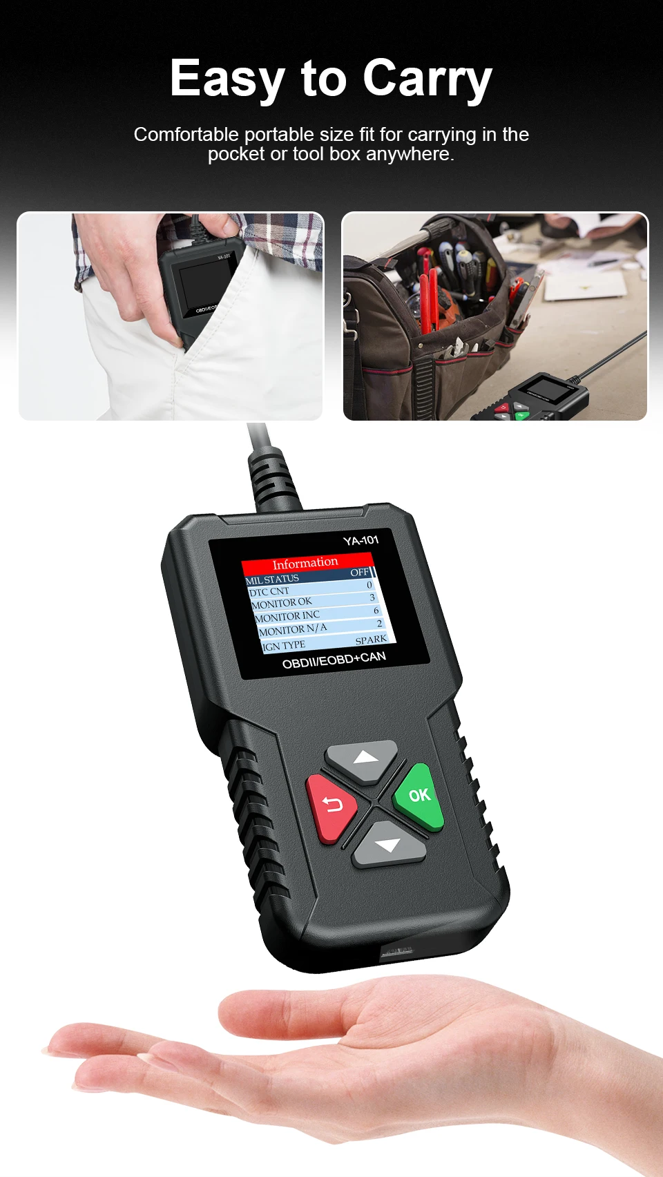 YA101 OBD2 Scanner check engine error code reader tool comes with 1.8 inch 160x120p clear color display and 10 languages support, more comfortable patented design, longer OBDII cable, life time free update and more enhenced functions like Battery Test, with high quality ABS plastic material black color fit for most of OBDII compliant car Error code reader.