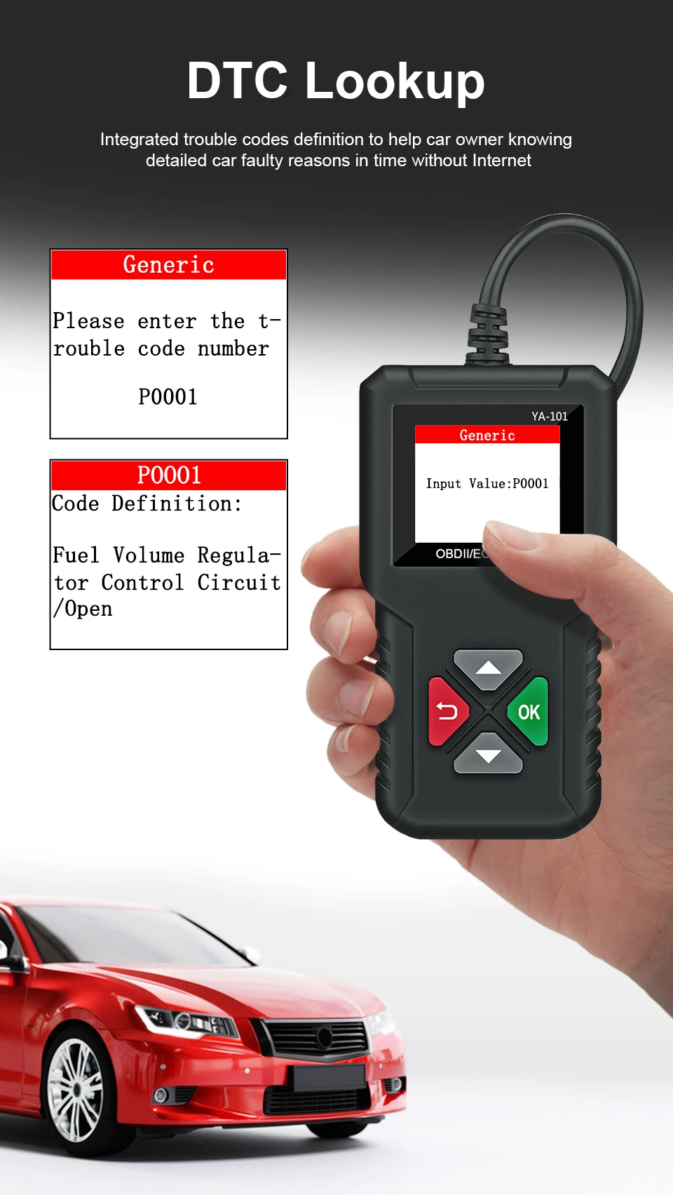 >>Accurate description of DTC, Unlike other scanners that do not have this function, YA101 code reader can read the error code reason of the product and indicate the possibility