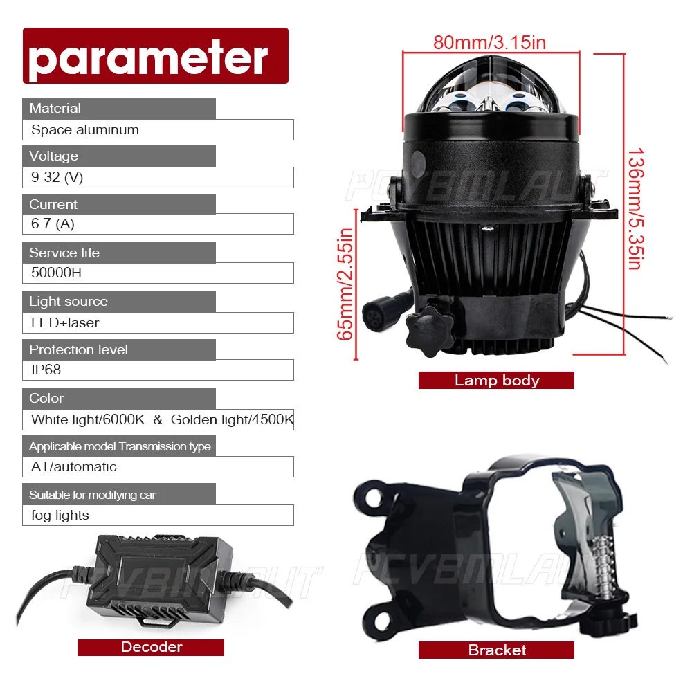 PCVBMLAUT Car Lights For Headlights Led Fog Lights Gold + White 3.0 inch 8000LM 38w Accessories Retrofit Projector Car Accessory
