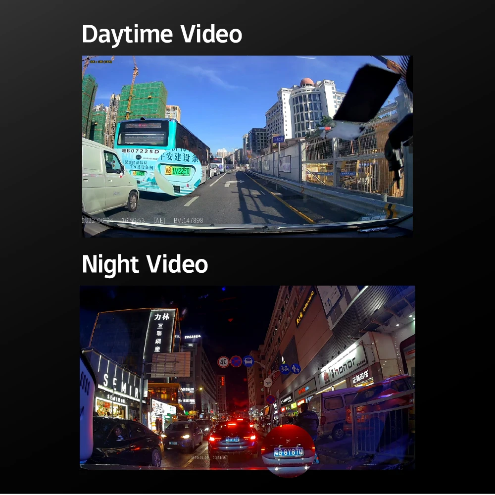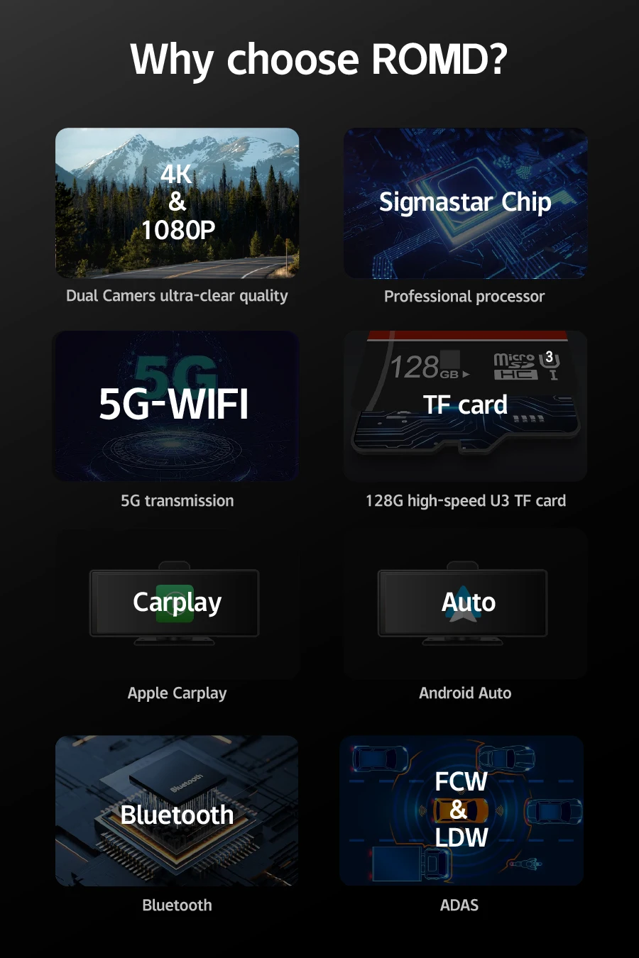 ROMD can achieve dual-channel recording, which provides all-round protection and allows you to drive safely. The front camera adopts a 170-degree A+level high-resolution wide-angle lens with a resolution of 3160 * 1560P (4K), and the rear camera AHD/TVI1080p 25/30fps. It can capture license plates, road signs and other key details on the road.