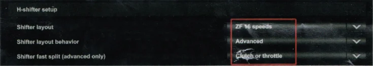Scroll down to “H-shifter setup”.When “Clutch or throttle” is selected for “”Shifter fast (advanced only)”,you can switch between Low/High gears by depressing the clutch or releasing the throttle.